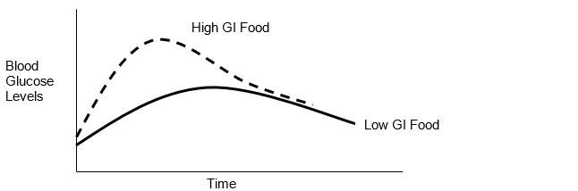 Some carbohydrate foods cause a more gradual rise in blood glucose levels as they are digested more slowly than other types. These types of carbohydrates have a lower glycaemic index (GI) and tend to be wholegrain varieties and higher in fibre and/or protein. It can be better to choose low GI options as they can help keep blood glucose levels lower after a meal and improve diabetes control. Page 4 shows foods low, medium and high GI. The graph below demonstrates the effect of glycaemic index on blood glucose levels: